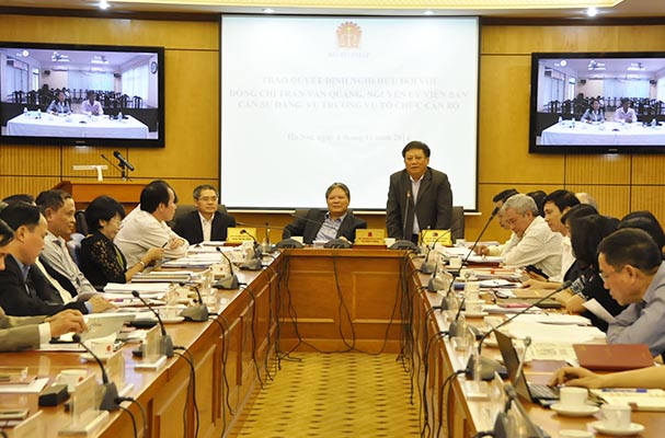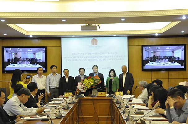 Chiều nay (04/11), Bộ trưởng Bộ Tư pháp Hà Hùng Cường đã chủ trì Hội nghị giao ban Lãnh đạo Bộ tháng 10, đồng thời trao quyết định nghỉ hưu cho đồng chí Trần Văn Quảng, nguyên ủy viên Ban Cán sự Đảng, Vụ trưởng Vụ Tổ chức cán bộ.