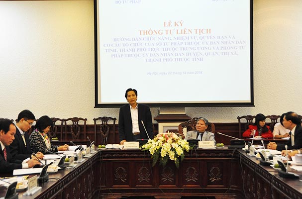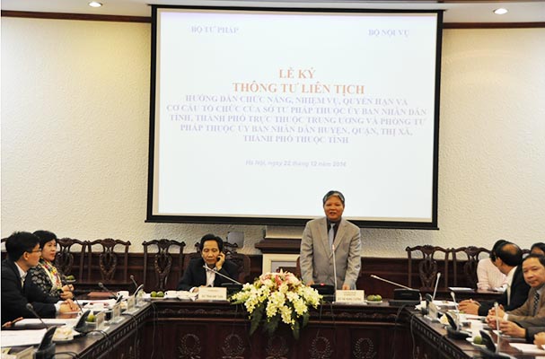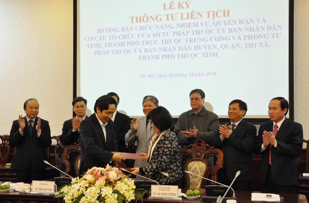 Chiều 22/12, thay mặt lãnh đạo Bộ Tư pháp và Bộ Nội vụ, Thứ trưởng Bộ Tư pháp Nguyễn Thúy Hiền và Thứ trưởng Bộ Nội vụ Trần Anh Tuấn đã ký kết Thông tư liên tịch số 23/2014/TTLT-BTP-BNV để thay thế Thông tư liên tịch số 01/2009/TTLT-BTP-BNV ngày 28/4/2009 của Bộ Tư pháp và Bộ Nội vụ hướng dẫn chức năng, nhiệm vụ, quyền hạn và cơ cấu tổ chức của Sở Tư pháp thuộc UBND cấp tỉnh, Phòng Tư pháp thuộc UBND cấp huyện và công tác tư pháp của UBND cấp xã. Buổi lễ ký kết diễn ra trang trọng với sự chứng kiến của Bộ trưởng Hà Hùng Cường cùng đại diện nhiều đơn vị trong và ngoài Bộ Tư pháp.