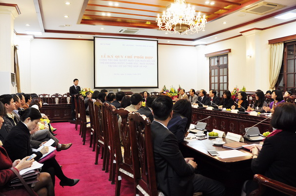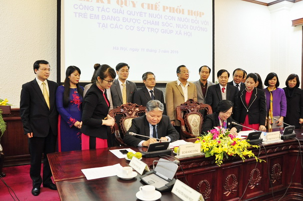 Chiều 11/3, tại trụ sở cơ quan Bộ Tư pháp đã diễn ra Lễ ký Quy chế phối hợp công tác giải quyết nuôi con nuôi đối với trẻ em đang được chăm sóc, nuôi dưỡng tại các cơ sở trợ giúp xã hội. Tham dự Lễ ký có Bộ trưởng Bộ Tư pháp Hà Hùng Cường, Bộ trưởng Bộ Lao động – Thương binh và Xã hội Phạm Thị Hải Chuyền, các Thứ trưởng Bộ Tư pháp Đinh Trung Tụng, Nguyễn Khánh Ngọc, Thứ trưởng Bộ Lao động - Thương binh và Xã hội Huỳnh Văn Tí cùng đại diện lãnh đạo các đơn vị thuộc 2 Bộ và đại diện tổ chức UNICEF.