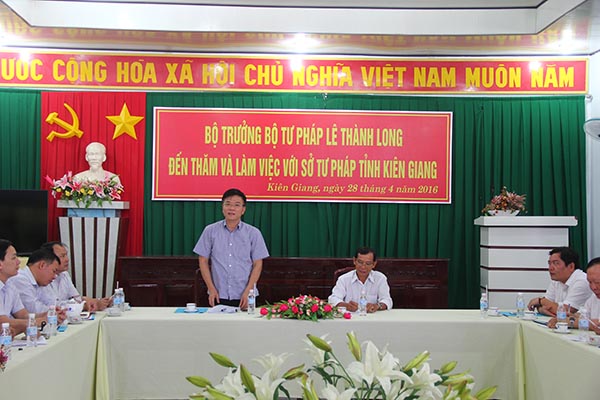 Chiều 28/4, Ủy viên Trung ương Đảng, Bộ trưởng Bộ Tư pháp Lê Thành Long cùng Đoàn công tác của Bộ Tư pháp đã có buổi làm việc với Thường trực Tỉnh ủy, HĐND, UBND, Ủy ban MTTQ tỉnh Kiên Giang. Các đồng chí Nguyễn Thanh Nghị, Bí thư tỉnh ủy; Đặng Tuyết Em, Phó bí thư thường trực tỉnh ủy, Chủ tịch HĐND tỉnh; Phạm Vũ Hồng, Phó bí thư tỉnh ủy, Chủ tịch UBND tỉnh; Nguyễn Hoàng Thắng, Ủy viên Ban Thường vụ Tỉnh ủy, Phó Chủ tịch HĐND tỉnh; Lê Thị Vệ, Ủy viên Ban Thường vụ Tỉnh ủy, Chủ tịch UBMTTQ tỉnh... cùng tiếp và làm việc với Đoàn.