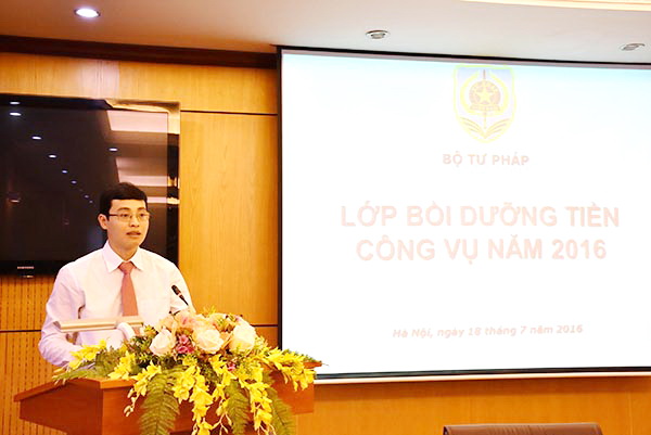 Sáng 18/7, Thứ trưởng Bộ Tư pháp Lê Tiến Châu đã đến dự và phát biểu khai giảng lớp tiền công vụ năm 2016 dành cho 62 công chức, viên chức trẻ.