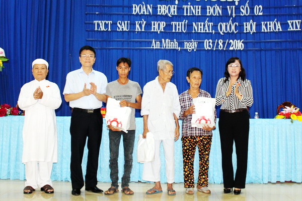 Qua buổi tiếp xúc cử tri, cử tri rất đồng tình những vấn đề mà Đoàn ĐBQH giải trình, trả lời với cử tri. Dịp này, Bộ trưởng Bộ Tư pháp cùng Đoàn ĐBQH tỉnh Kiên Giang đơn vị số 2 đã trao 6 phần cho các gia đình có hoàn cảnh khó khăn trên địa bàn huyện An Minh và An Biên tỉnh Kiên Giang.