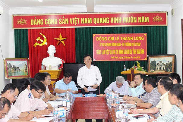 Chiều 28/9, Ủy viên Ban chấp hành Trung ương Đảng, Bộ trưởng Bộ Tư pháp Lê Thành Long và Đoàn công tác đã đến làm việc với Thường trực Tỉnh ủy, HĐND, UBND Thái Bình về công tác tư pháp và Thi hành án dân sự. Trước đó, Bộ trưởng đã tới thăm và làm việc với Cục Thi hành án dân sự tỉnh.