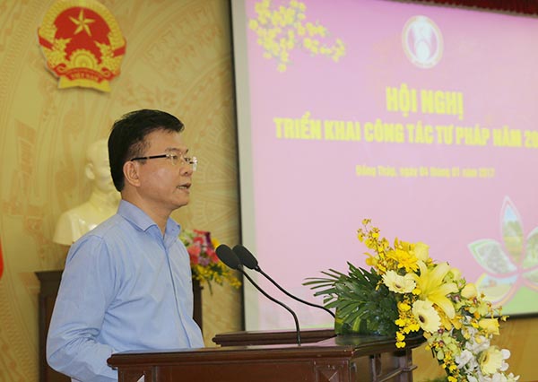Chiều cùng ngày, Bộ trưởng Bộ Tư pháp đã đến tham dự và chỉ đạo Hội nghị triển khai công tác năm 2017 do Sở Tư pháp Đồng Tháp tổ chức. Tại đây, Bộ trưởng Bộ Tư pháp ghi nhận sự nỗ lực của ngành tư pháp, đặc biệt là sự chỉ đạo kịp thời, sâu sát của các cấp ủy, chính quyền địa phương để tư pháp và THADS đạt được kết quả cao. Bộ trưởng đánh giá, công tác Tư pháp Đồng Tháp được triển khai thực hiện tương đối tốt, bài bản, có cách làm sáng tạo, gần dân. Đây là đơn vị tiên phong trong công tác phổ biến giáo dục pháp luật bằng mạng xã hội - một hình thức tuyên truyền mới, rất hiệu quả.