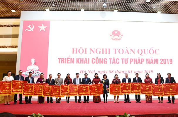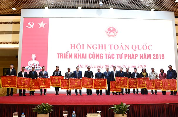Cờ thi đua ngành Tư pháp được trao cho 10 đơn vị thuộc Bộ (Văn phòng Bộ, Vụ Pháp luật dân sự kinh tế, Vụ Pháp luật hình sự hành chính, Vụ Hợp tác quốc tế, Báo Pháp luật Việt Nam, Trường Đại học Luật Hà Nội, Trung tâm Lý lịch tư pháp quốc gia, Cục Kiểm tra văn bản quy phạm pháp luật, Cục Quản lý xử lý vi phạm hành chính và theo dõi thi hành pháp luật, Thanh tra Bộ) và cho 23 Sở Tư pháp (Bạc Liêu, Bà Rịa Vũng Tàu, TP HCM, Đồng Tháp, Sóc Trăng, Phú Thọ, Kiên Giang, Long An, Tiền Giang, Hải Dương, Bình Dương, Gia Lai, Hà Nội, Lâm Đồng, Lạng Sơn, Nghệ An, Lai Châu, Bắc Giang, Ninh Bình, Thừa Thiên Huế, Quảng Bình, Bắc Kạn, Quảng Ngãi).Hội nghị cũng công bố và trao Quyết định công nhận điển hình tiên tiến ngành Tư pháp năm 2018 cho 16 tập thể và 15 cá nhân; công bố Quyết định công nhận Chiến sĩ thi đua ngành Tư pháp cho 3 cá nhân khối các đơn vị thuộc Bộ; trao Bằng khen của Bộ trưởng Bộ Tư pháp cho 51 tập thể, 51 cá nhân có thành tích xuất sắc trong đợt thi đua đặc biệt kỷ niệm 70 năm Chủ tịch Hồ Chí Minh ra Lời kêu gọi thi đua ái quốc.Bài: An Như