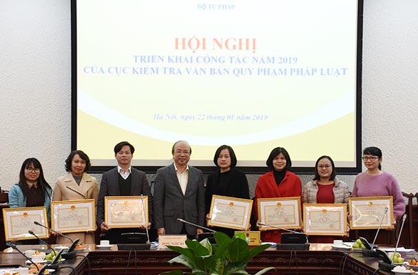 Nhân dịp này, thay mặt Ban cán sự Đảng, Lãnh đạo Bộ, Thứ trưởng đã trao tặng Bằng khen của Bộ trưởng Bộ Tư pháp cho 3 tập thể và 8 cá nhân có thành tích xuất sắc trong công tác năm 2018.