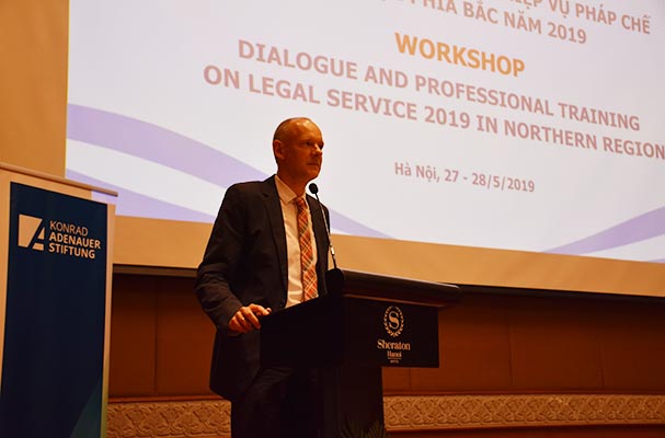 Trưởng Đại diện Viện KAS Peter Girke nhấn mạnh mục đích chính của Hội nghị là trang bị, nâng cao kỹ năng cho cán bộ pháp chế ở các cơ quan, địa phương cũng như nâng cao hiệu quả trong tổ chức công việc; trợ giúp cho các cán bộ pháp chế nắm bắt những yêu cầu ngày càng cao trong công việc.