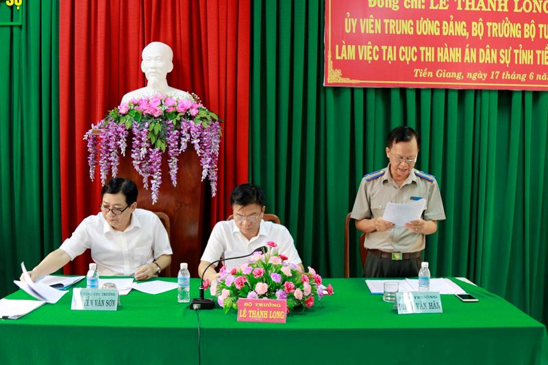 Ngày 17/6, Đoàn Công tác Bộ Tư pháp do Bộ trưởng Lê Thành Long làm Trưởng đoàn đã làm việc với Tỉnh ủy, HĐND và UBND tỉnh Tiền Giang. Trước đó, Đoàn cũng đã thăm và làm việc với Sở Tư pháp tỉnh và Cục THADS tỉnh.