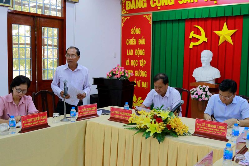 Trình bày với Đoàn công tác về tình hình hoạt động Tư pháp địa phương, ông Trần Thanh Khiết, Phó Giám đốc Sở Tư pháp Trà Vinh cho biết, thời gian qua, ngành Tư pháp tỉnh đã triển khai thực hiện đồng bộ và đầy đủ công việc chuyên môn được giao phó. Tỉnh đã tập trung củng cố kiện toàn Hội đồng phối hợp Phổ biến giáo dục pháp luật cấp tỉnh, huyện. Từ đó, đẩy mạnh hiệu quả tuyên truyền, nâng cao nhận thức, hiểu biết pháp luật của các tầng lớp nhân dân. Toàn tỉnh, tổ chức gần 10.000 cuộc tuyên truyền pháp luật cho gần 390.000 lượt người tham dự. Đồng thời, tổ chức 8 phiên tòa giả định nhằm tuyên truyền pháp luật thu hút hơn 1.400 lượt học sinh, giáo viên và người dân. Ngoài ra, phát hành 3.600 quyển tài liệu tuyên truyền đến các Sở, ban ngành, đoàn thể, huyện, xã, các điểm chùa Khmer trên địa bàn tỉnh.