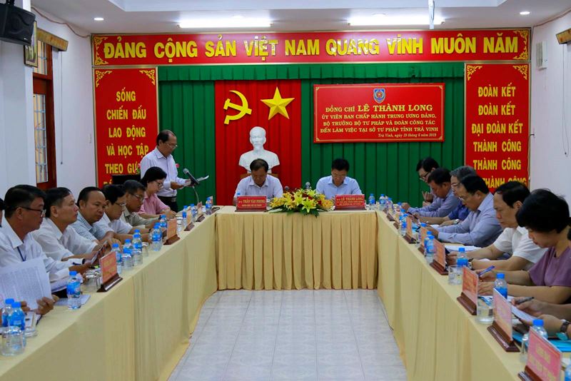Sáng ngày 19/6, đồng chí Lê Thành Long, Uỷ viên Ban Chấp hành Trung ương Đảng, Bộ trưởng Bộ Tư pháp và Đoàn công tác đến thăm và làm việc tại Sở Tư pháp tỉnh Trà Vinh. Tiếp và làm việc với đoàn có ông Trần Văn Phong, Giám đốc Sở Tư pháp; các Phó Giám đốc. Đại diện Hội Luật gia; Đoàn Luật sư tỉnh; cùng lãnh đạo các phòng chuyên môn, Phòng Tư pháp các huyện, thành phố.