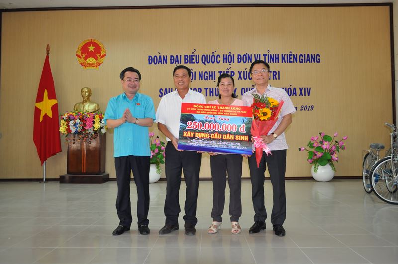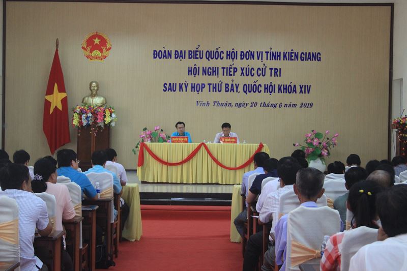Tại buổi tiếp xúc cử tri, Bộ trưởng Bộ Tư pháp Lê Thành Long - ĐBQH tỉnh Kiên Giang báo cáo với các cử tri về kết quả kỳ họp của Quốc hội vừa diễn ra tại Hà Nội. Trong đó, Quốc hội đã xem xét thông qua 7 Luật, 10 Nghị quyết, xem xét cho ý kiến 10 dự án luật khác; kết quả hoạt động giám sát tối cao chuyên đề; Tiến hành giám sát tối cao chuyên đề “việc thực hiện chính sách, pháp luật về quy hoạch, quản lý, sử dụng đất đai tại đô thị từ khi Luật Đất đai năm 2013 có hiệu lực đến hết năm 2018”.