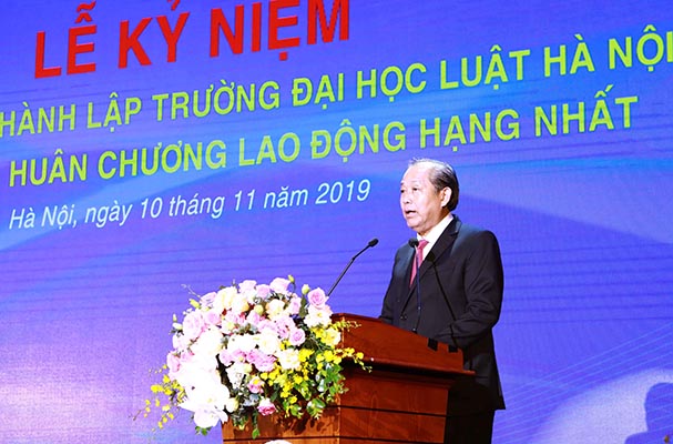 Tại Lễ kỷ niệm, Phó Thủ tướng Thường trực Chính phủ Trương Hòa Bình đã trang trọng gắn Huân chương Lao động hạng Nhất lên lá cờ truyền thống của Trường. Phát biểu tại buổi Lễ, Phó Thủ tướng nhấn mạnh công tác đào tạo nguồn nhân lực pháp luật chất lượng cao cho đất nước là nhiệm vụ quan trọng được Đảng, Nhà nước quan tâm. Đặc biệt, trong giai đoạn phát triển mới, hợp tác, hội nhập quốc tế ngày càng sâu rộng và những biến chuyển ngày càng nhanh của các quan hệ xã hội, kinh tế, dân sự, nhiệm vụ cải cách pháp luật, cải cách tư pháp, xây dựng nhà nước pháp quyền XHCN là hết sức quan trọng, đòi hỏi đổi mới cách tiếp cận, tư duy pháp lý trong đào tạo, nghiên cứu và giải quyết các vấn đề thực tiễn trước mắt và tương lai.