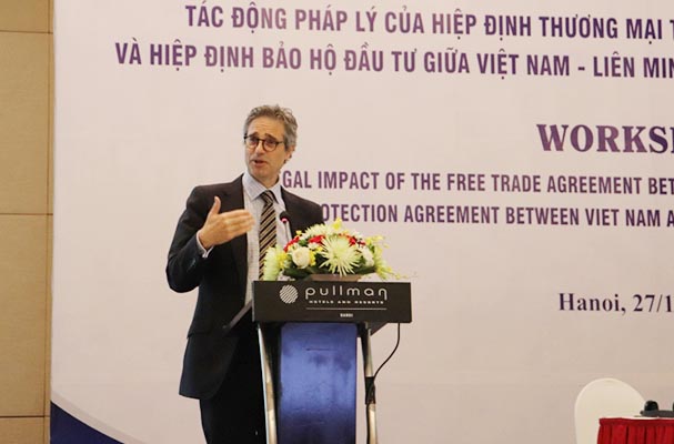 Thứ trưởng cho biết, Việt Nam ngày nay được biết đến là một nền kinh tế có độ mở vào loại cao trên thế giới, ký kết nhiều hiệp định thương mại, đầu tư với mục tiêu đem lại cơ hội phát triển cho đất nước. Đồng thời, trong quá trình hội nhập, Việt Nam cũng đặc biệt quan tâm đến việc rà soát, đánh giá các quy định pháp luật trong nước để bảo đảm điều kiện thuận lợi vừa hoàn thiện pháp luật trong nước được đồng bộ, thống nhất vừa thực hiện các cam kết quốc tế, dần dần tiến tới những chuẩn mực quốc tế.