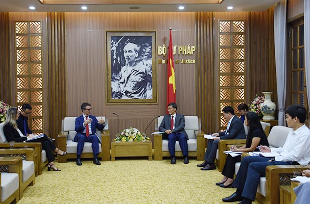 Ngày 18/9, Thứ trưởng Bộ Tư pháp Nguyễn Khánh Ngọc cùng đại diện lãnh đạo một số đơn vị thuộc Bộ đã tiếp ông Giorgio Aliberti, Đại sứ - Trưởng Phái đoàn Liên minh Châu Âu (EU) tại Việt Nam.