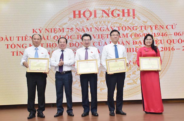 Đồng chí Mai Văn Huỳnh - Phó Bí thư Thường trực Tỉnh ủy, Chủ tịch Hội đồng nhân dân tỉnh tặng Bằng khen của Ủy ban nhân dân tỉnh cho 4 cá nhân có thành tích xuất sắc trong hoạt động của Đoàn đại biểu Quốc hội đơn vị tỉnh Kiên Giang khóa XIV, nhiệm kỳ 2016-2021