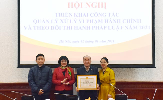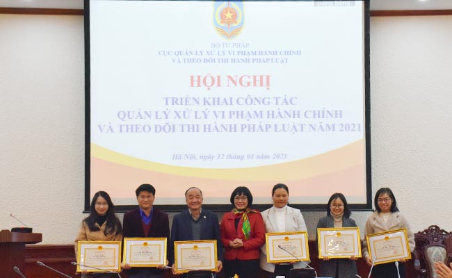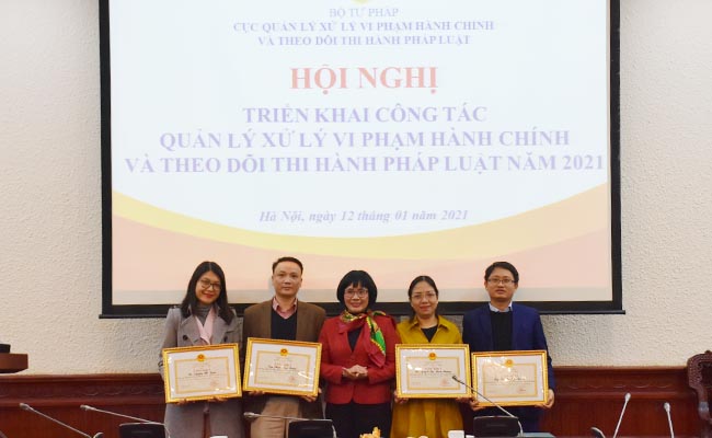 Nhân dịp này, Thứ trưởng Đặng Hoàng Oanh đã trao Bằng khen của Bộ trưởng Bộ Tư pháp cho 03 tập thể, 04 cá nhân có thành tích xuất sắc trong công tác nâng xếp hạng chỉ số Chi phí tuân thủ pháp luật. Đồng thời, Cục QLXLVPHC&TDTHPL cũng phát động phong trào thi đua năm 2021.