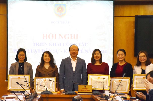 Nhân dịp này, Thứ trưởng Phan Chí Hiếu trao tặng Bằng khen của Bộ trưởng Bộ Tư pháp cho 02 tập thể và 04 cá nhân Vụ PLDSKT đã có thành tích xuất sắc trong công tác năm 2020.