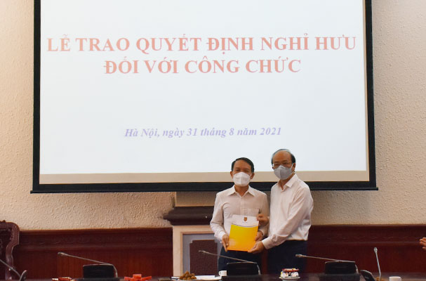 Ngày 31/8, Thứ trưởng Bộ Tư pháp Phan Chí Hiếu đã trao Quyết định nghỉ hưu cho đồng chí Nguyễn Văn Vẻ, Chuyên viên cao cấp, Trưởng phòng phòng Quản lý công chứng, thừa phát lại, Cục Bổ trợ tư pháp được nghỉ hưu để hưởng chế độ bảo hiểm xã hội kể từ ngày 01 tháng 9 năm 2021.