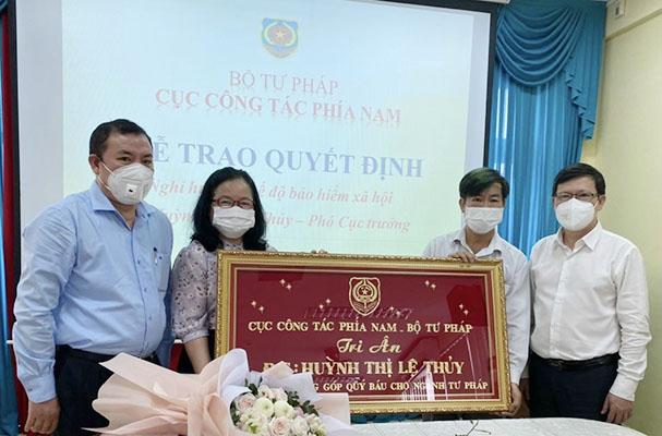 Nhân dịp này, Thứ trưởng Mai Lương Khôi cũng đã trực tiếp trao quyết định nghỉ hưu cho đồng chí Huỳnh Thị Lệ Thủy, nguyên Phó Cục trưởng Cục Công tác phía Nam. Nhân dịp này, Thứ trưởng đã ghi nhận, đánh giá cao những đóng góp của đồng chí Huỳnh Thị Lệ Thủy đối với Bộ Tư pháp nói riêng và ngành Tư pháp nói chung trong suốt hơn 36 năm qua. Đồng chí Huỳnh Thị Lệ Thủy cảm ơn sự quan tâm của Lãnh đạo Bộ Tư pháp, đặc biệt là Thứ trưởng Mai Lương Khôi và Cục Công tác phía Nam trong điều kiện khó khăn đã tổ chức được buổi lễ trao quyết định nghỉ hưu trang trọng, nghĩa tình. Đồng chí Huỳnh Thị Lệ Thủy tự hào được là công chức của ngành Tư pháp trong thời gian qua, đồng thời hứa tiếp tục tu dưỡng phẩm chất, đạo đức của người cán bộ, đảng viên khi nghỉ hưu, trở về địa phương là một công dân gương mẫu, luôn xứng đáng là cán bộ của Ngành Tư pháp.