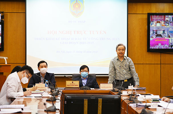 Chiều nay (11/11), Bộ Tư pháp đã tổ chức Hội nghị trực tuyến triển khai kế hoạch đầu tư công trung hạn giai đoạn 2021-2025. Thứ trưởng Mai Lương Khôi, Tổng cục trưởng Tổng cục THADS Nguyễn Quang Thái, Cục trưởng Cục Kế hoạch Tài chính Phan Anh Tuấn chủ trì Hội nghị.