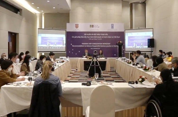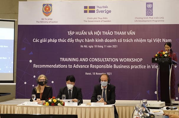 Ngày 18/11, Bộ Tư pháp (được sự hỗ trợ của Chương trình phát triển Liên hợp quốc (UNDP) tại Việt Nam và Đại sứ quán Vương quốc Thụy Điển tại Việt Nam) đã tổ chức Tập huấn và Hội thảo tham vấn “Các giải pháp thúc đẩy thực hành kinh doanh có trách nhiệm tại Việt Nam”. Tập huấn và Hội thảo tham vấn được tổ chức trực tiếp tại điểm cầu Hà Nội và Thanh Hóa và trực tuyến qua ứng dụng Zoom tại Thành phố Hồ Chí Minh, Bình Dương, Đồng Nai và một số địa phương khác. Ông Nguyễn Thanh Tịnh, Thứ trưởng Bộ Tư pháp, bà Ann Måwe, Đại sứ Vương quốc Thụy Điển tại Việt Nam và ông Patrick Havernman, Phó Đại diện Thường trú, UNDP Việt Nam đã tham dự và có bài phát biểu khai mạc Tập huấn và Hội thảo tham vấn.