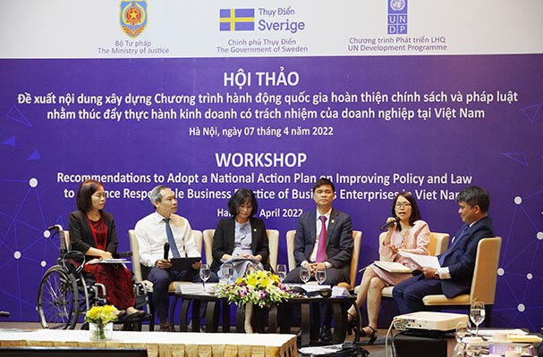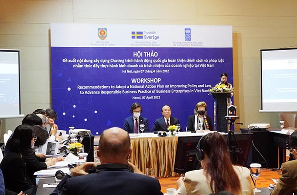 Sáng ngày 07/4/2022, Bộ Tư pháp (với sự hỗ trợ của Chương trình phát triển Liên hợp quốc (UNDP) tại Việt Nam và Đại sứ quán Vương quốc Thụy Điển tại Việt Nam) đã tổ chức Hội thảo “Đề xuất nội dung xây dựng Chương trình hành động quốc gia hoàn thiện chính sách và pháp luật nhằm thúc đẩy thực hành kinh doanh có trách nhiệm của doanh nghiệp tại Việt Nam”. Hội thảo được tổ chức theo hình thức trực tiếp tại điểm cầu Hà Nội kết hợp với hình thức trực tuyến qua ứng dụng Zoom tại Thành phố Hồ Chí Minh, Bình Dương, Đồng Nai, Hải Phòng, Đà Nẵng, Cần Thơ, Quảng Ninh, Thanh Hóa và một số địa phương khác.