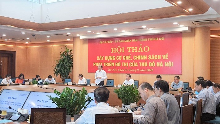 Ngày 31/8, Bộ Tư pháp đã phối hợp với UBND TP.Hà Nội tổ chức Hội thảo “Xây dựng cơ chế, chính sách về phát triển đô thị của Thủ đô Hà Nội”. Thứ trưởng Bộ Tư pháp Phan Chí Hiếu và Phó Chủ tịch UBND thường trực TP.Hà Nội Lê Hồng Sơn đồng chủ trì Hội thảo.