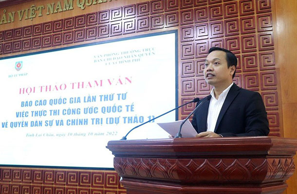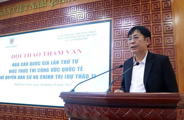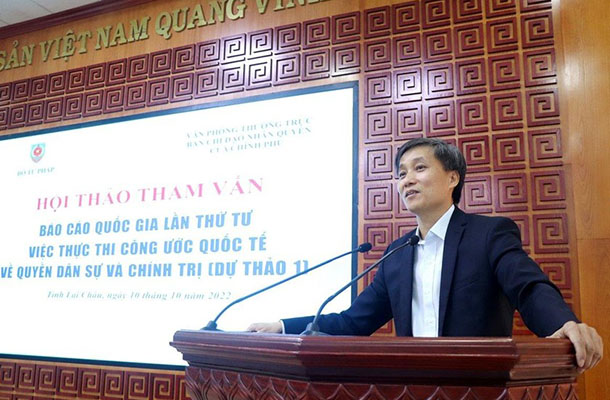 Ngày 10/10/2022, tại Lai Châu, Bộ Tư pháp phối hợp với Văn phòng Thường trực Ban chỉ đạo Nhân quyền của Chính phủ tổ chức Hội thảo tham vấn Báo cáo quốc gia lần thứ tư việc thực thi Công ước quốc tế về các quyền dân sự và chính trị (dự thảo 1). Hội thảo do Thứ trưởng Bộ Tư pháp Nguyễn Khánh Ngọc; Thiếu tướng Nguyễn Văn Kỷ, Phó Chánh Văn phòng Thường trực Ban chỉ đạo Nhân quyền Chính phủ đồng chủ trì. Về phía tỉnh Lai Châu, Phó Bí thư Tỉnh ủy, Chủ tịch Ủy ban Nhân dân tỉnh Lai Châu Trần Tiến Dũng đến dự và phát biểu chào mừng Hội thảo.