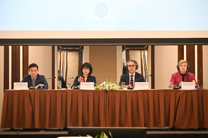 Phiên thảo luận hoàn thiện và thực thi pháp luật với chủ đề “Nâng cao năng lực chuyên sâu về tư pháp người chưa thành niên nhằm tăng cường bảo vệ người chưa thành niên có liên quan đến pháp luật” nằm trong khuôn khổ Dự án Tăng cường pháp luật và tư pháp tại Việt Nam (Dự án EU JULE) do Liên minh Châu Âu tài trợ, với đóng góp tài chính từ UNICEF và UNDP đã được tổ chức tại Hà Nội vào ngày 18/11. Thứ trưởng Bộ Tư pháp Đặng Hoàng Oanh, Trưởng Phái đoàn Liên minh Châu Âu tại Việt Nam Giorgio Aliberti, Trưởng Đại diện UNICEF tại Việt Nam Rana Flowers, Phó Vụ trưởng Vụ Hợp tác quốc tế Đào Quý Lộc đồng chủ trì Phiên thảo luận.