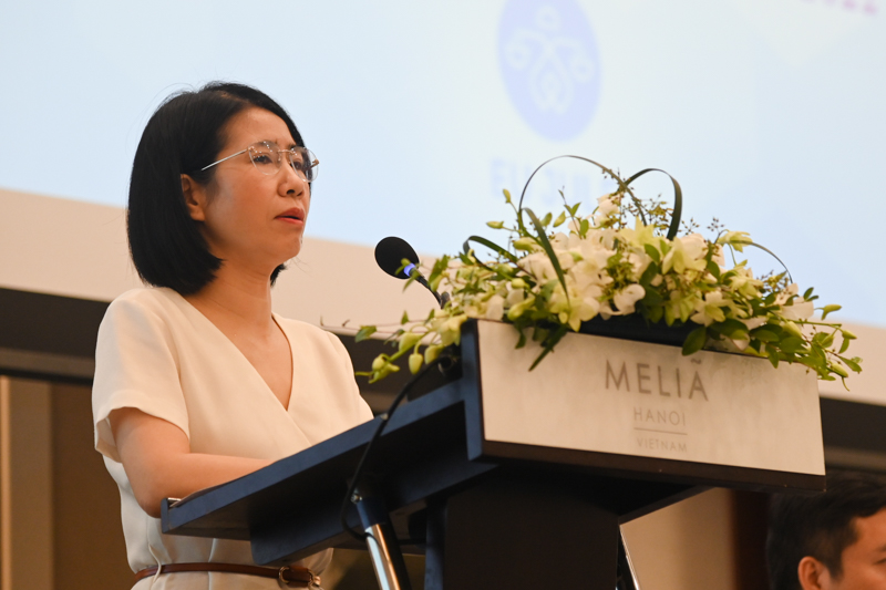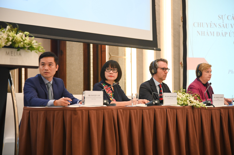 Từ trái qua phải, đồng chủ trì Phiên thảo luận gồm có: ông Đào Quý Lộc - Phó Vụ trưởng Vụ Hợp tác quốc tế Bộ Tư Pháp, bà Đặng Hoàng Oanh - Thứ trưởng Bộ Tư Pháp, ông Giorgio Aliberti - Đại sứ Liên minh Châu Âu tại Việt Nam, bà Rana Flowers - Trưởng Đại diện UNICEF tại Việt Nam.