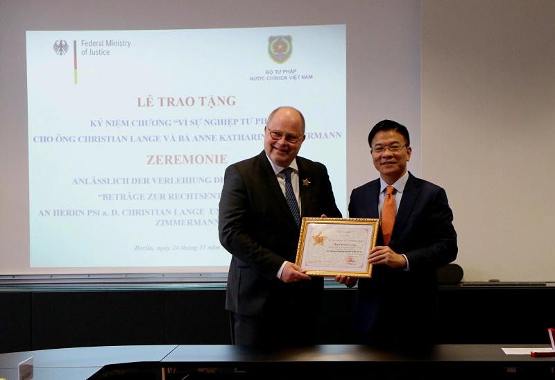 Kết thúc buổi làm việc, Bộ trưởng Lê Thành Long đã trao Kỷ niệm chương vì Sự nghiệp Tư pháp cho Ông Christian Lange, Nguyên Quốc vụ khanh Bộ Tư pháp CHLB Đức, Chủ tịch Quỹ Hợp tác Pháp luật IRZ và bà Anne Katharina Zimmermannm, Vụ trưởng Vụ Hợp tác quốc tế Bộ Tư pháp CHLB Đức.