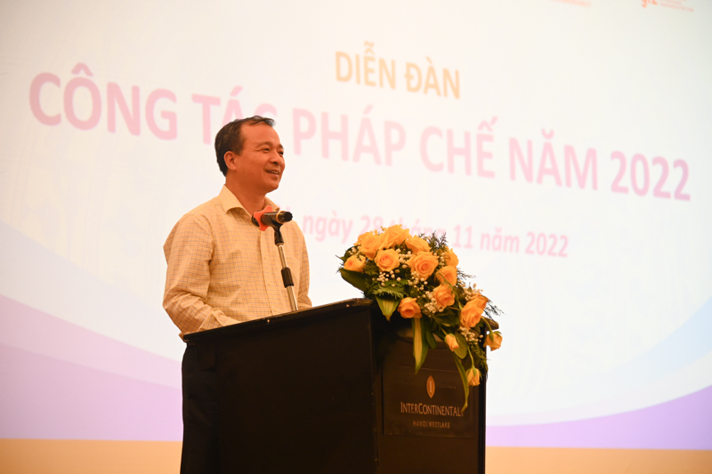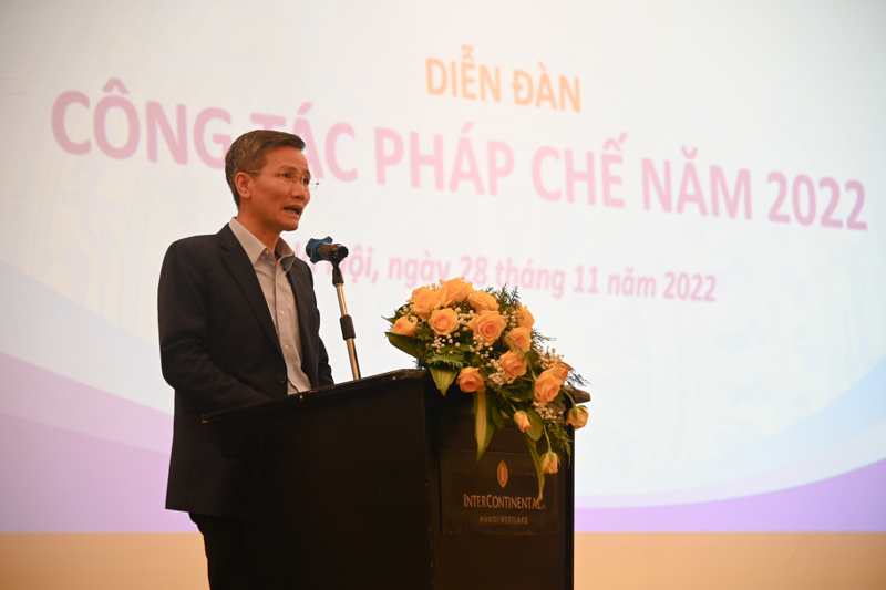 Tại Diễn đàn, Vụ trưởng Vụ Các vấn đề chung về xây dựng pháp luật, Bộ Tư pháp Nguyễn Hồng Tuyến trình bày báo cáo tình hình công tác pháp chế năm 2022, kết quả đạt được, tồn tại, hạn chế, khó khăn, vướng mắc, giải pháp nâng cao chất lượng, hiệu quả trong thực hiện công tác pháp chế. Đồng chí cho biết, tính đến ngày 01/8/2022, cả nước có 9.858 người làm công tác pháp chế, tăng 465 người so với tháng 4/2021, cụ thể tại các Bộ, cơ quan ngang Bộ, cơ quan thuộc Chính phủ có 5.040 người; tại các cơ quan chuyên môn thuộc UBND cấp tỉnh có 3.084 người; tại các doanh nghiệp nhà nước ở Trung ương có 1.734 người. Đội ngũ cán bộ pháp chế đã giúp cho Bộ trưởng, Thủ trưởng cơ quan ngang Bộ, cơ quan thuộc Chính phủ, cơ quan chuyên môn thuộc UBND cấp tỉnh thực hiện việc quản lý nhà nước bằng pháp luật, góp phần quan trọng nâng cao chất lượng và hiệu quả hoạt động xây dựng và tổ chức thi hành pháp luật ở các Bộ, ngành, địa phương.