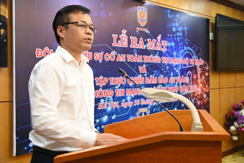 Phát biểu khai mạc buổi Lễ, Phó Cục trưởng Cục Công nghệ thông tin Phạm Đức Dụ cho biết, với 36 hệ thống thông tin, cơ sở dữ liệu của Bộ, ngành Tư pháp, công tác an toàn thông tin mạng nói chung và công tác đảm bảo an toàn thông tin mạng của Bộ nói riêng là trụ cột quan trọng, xuyên suốt để tạo lập niềm tin số và bảo vệ sự phát triển thịnh vượng của đất nước trong kỷ nguyên số. Đồng chí nhấn mạnh, ứng cứu sự cố an toàn thông tin mạng là hoạt động then chốt, có tính cấp thiết giúp các cơ quan, tổ chức giảm thiểu thiệt hại, ngay cả khi xảy ra sự cố nghiêm trọng, vì vậy, hoạt động ứng cứu sự cố an toàn thông tin mạng phải chuyển từ bị động sang chủ động: chủ động thực hiện săn lùng mối nguy hại và rà quét lỗ hổng trên các hệ thống thông tin trong phạm vi quản lý; ban hành phương án, kịch bản ứng cứu sự cố cho hệ thống thông tin, tổ chức diễn tập thực chiến nhằm đánh giá khả năng phòng ngừa xâm nhập và khả năng phát hiện kịp thời các điểm yếu về quy trình, công nghệ, con người. Đồng chí hy vọng việc thành lập Đội ứng cứu sự cố an toàn thông tin mạng Bộ Tư pháp sẽ góp phần nâng cao hiệu quả công tác ứng cứu sự cố của Bộ.