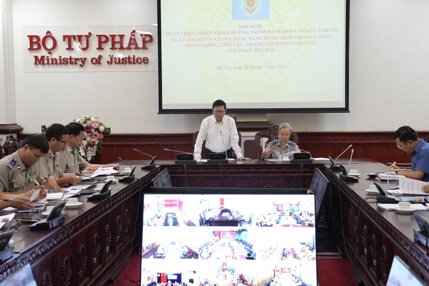 Chiều 26/7, Tổng cục Thi hành án dân sự (THADS) đã tổ chức Hội nghị theo hình thức trực tiếp và trực tuyến với các cơ quan THADS các tỉnh, thành phố trực thuộc Trung ương về quán triệt, triển khai Chương trình hành động phòng, chống tham nhũng, tiêu cực trong THADS giai đoạn 2023 – 2026 của Ban cán sự đảng Bộ Tư pháp.