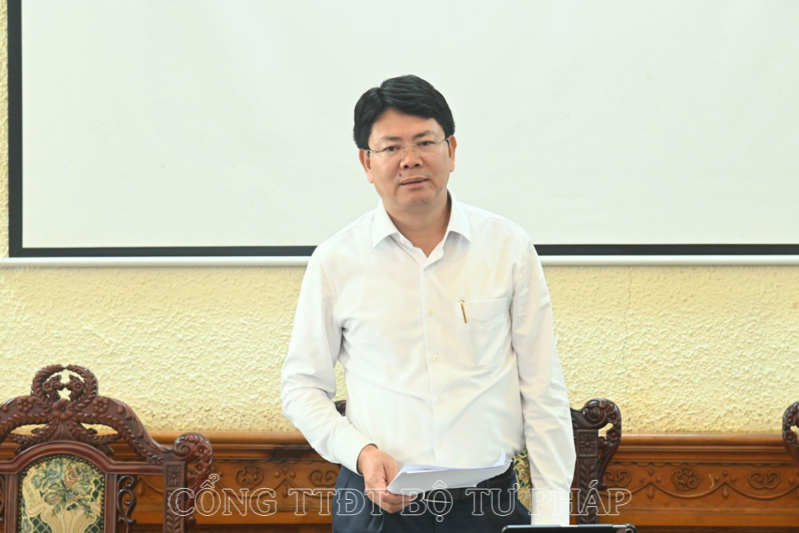 Đồng chí Nguyễn Duy Thắng, Phó Cục trưởng Cục Kiểm tra VBQPPL báo cáo tình hình rà soát văn bản QPPL thực hiện Đề án 06 tại buổi làm việc