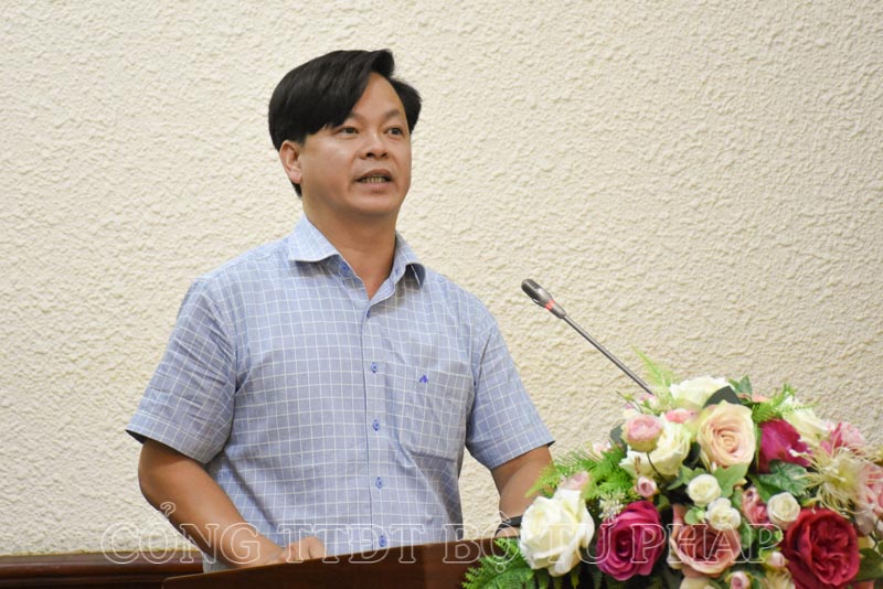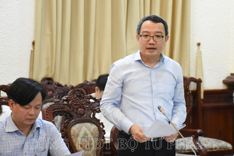 Phó Cục trưởng Cục Kiểm tra VBQPPL Nguyễn Duy Thắng báo cáo tại cuộc họp