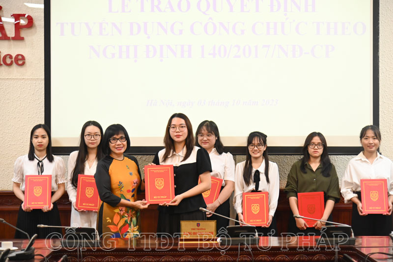 Thực hiện chính sách thu hút, tạo nguồn cán bộ từ sinh viên tốt nghiệp xuất sắc, cán bộ khoa học trẻ, thay mặt Lãnh đạo Bộ, Thứ trưởng Đặng Hoàng Oanh đã trao quyết định tuyển dụng cho 07 công chức trẻ về làm việc tại Bộ Tư pháp.