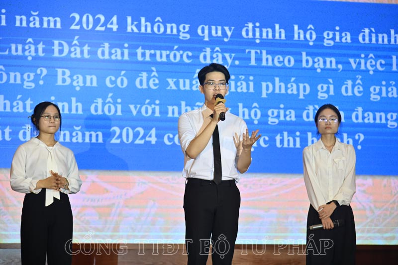 Tối ngày 18/6, Đoàn Thanh niên Bộ Tư pháp chủ trì, phối hợp với Đoàn Thanh niên Trường Đại học Luật Hà Nội tổ chức Vòng Chung kết “Cuộc thi tìm hiểu pháp luật Đất đai E-Golden năm 2024”. Tham dự cuộc thi có Thứ trưởng Bộ Tư pháp Nguyễn Thanh Tịnh; Đồng chí Bùi Hoàng Tùng - Ủy viên BCH Đảng bộ khối, Ủy viên BTV Trung ương Đoàn, Bí thư Đoàn khối; TS. Chu Mạnh Hùng – Bí thư Đảng uỷ, Chủ tịch Hội đồng Trường Đại học Luật Hà Nội.