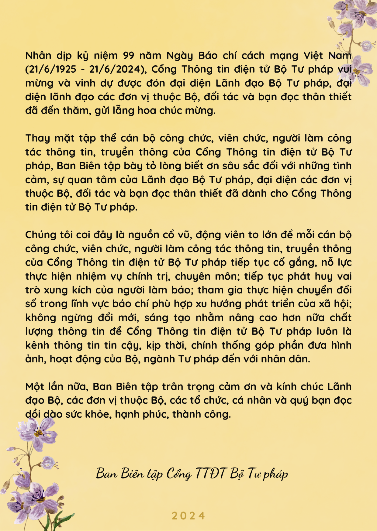 • Lãnh đạo Bộ Tư pháp chúc mừng Ngày Báo chí Cách mạng Việt Nam 21/6 (21/06/2024)