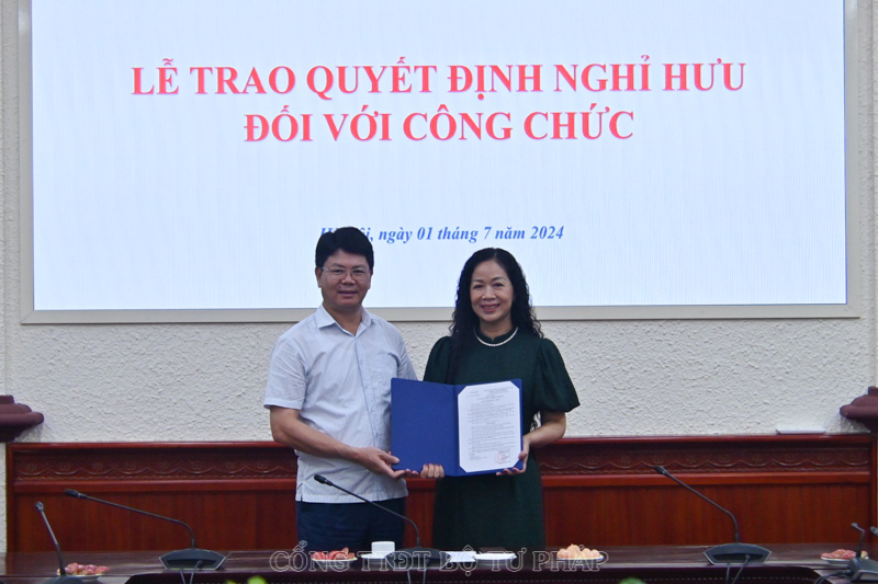 Thứ trưởng Nguyễn Thanh Tịnh trao quyết định nghỉ hưu cho đồng chí Nguyễn Thị Ngọc Lan, Trưởng phòng Tài chính - Kế toán, Văn phòng Bộ.Tư pháp.