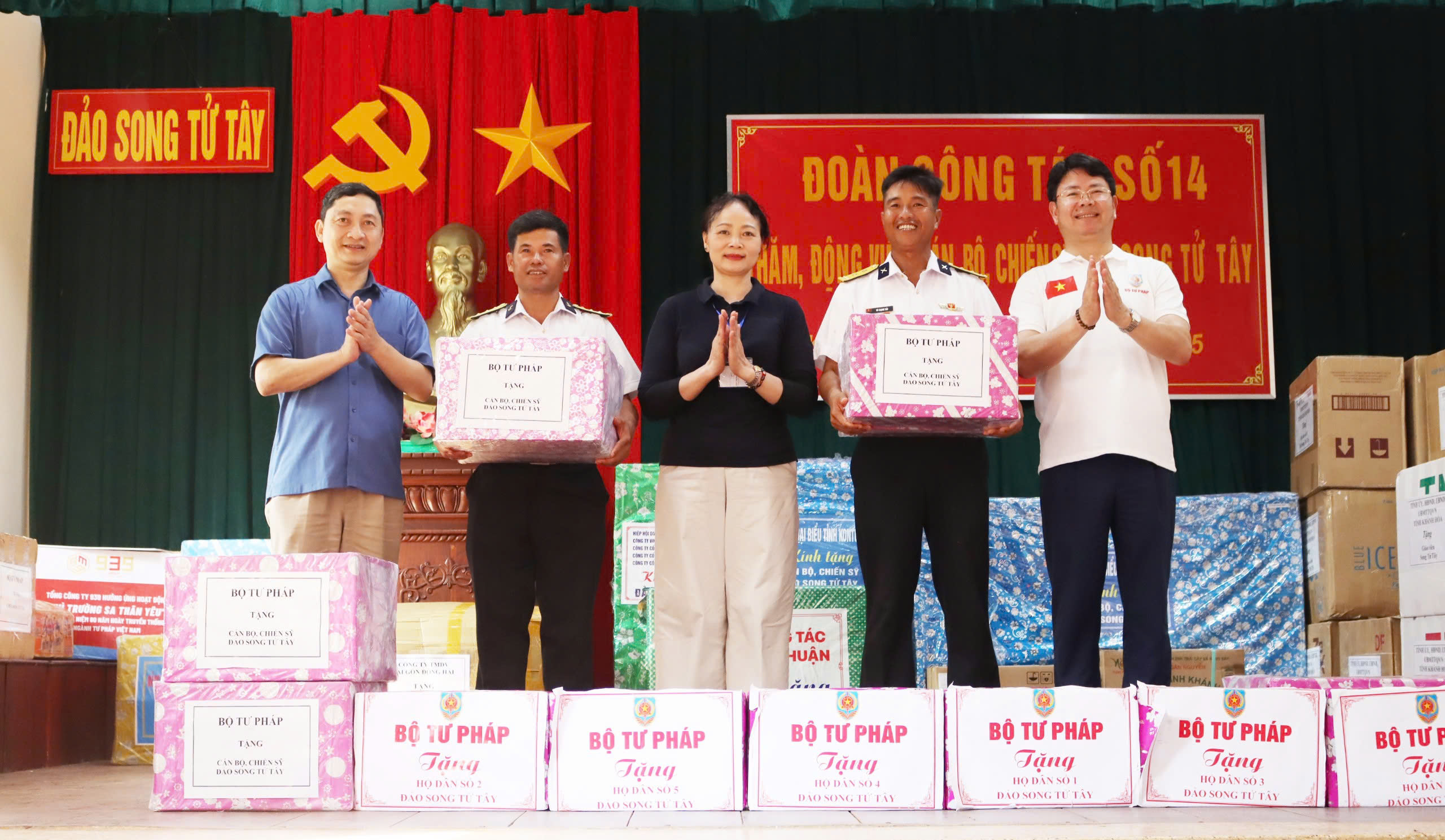 Thứ trưởng Nguyễn Thanh Tịnh, Trưởng Đoàn công tác Bộ Tư pháp và hai Phó Trưởng Đoàn Trần Anh Đức (Chánh Văn phòng Đảng uỷ Bộ Tư pháp), Khương Thị Thanh Huyền (Chủ tịch Công đoàn Bộ Tư pháp) tặng quà cho quân, dân đảo Song Tử Tây.