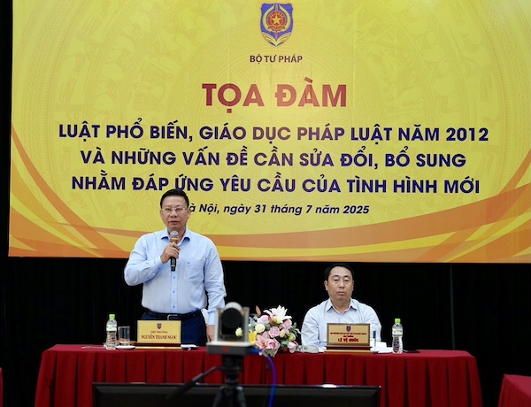Chiều 31/7, Bộ Tư pháp tổ chức Tọa đàm “Luật Phổ biến, giáo dục pháp luật năm 2012 và những vấn đề cần sửa đổi, bổ sung nhằm đáp ứng yêu cầu của tình hình mới”. Thứ trưởng Bộ Tư pháp Nguyễn Thanh Ngọc; Cục trưởng Cục Phổ biến, giáo dục pháp luật và Trợ giúp pháp lý Lê Vệ Quốc đồng chủ trì Tọa đàm.