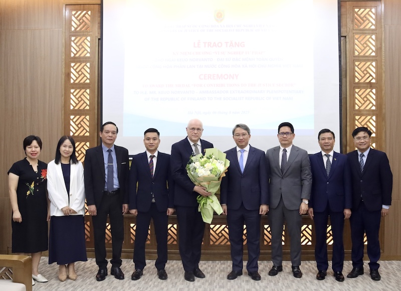 Chiều 6/8, tại trụ sở Bộ Tư pháp, Bộ trưởng Nguyễn Hải Ninh đã trao Kỷ niệm chương “Vì sự nghiệp tư pháp” cho ông Keijo Norvanto, Đại sứ Đặc mệnh toàn quyền Cộng hòa Phần Lan tại Việt Nam, ghi nhận những đóng góp tích cực trong thúc đẩy hợp tác pháp luật và tư pháp giữa hai nước.
