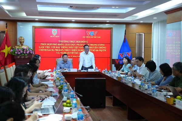 Ngày 7/8, Thứ trưởng Bộ Tư pháp Nguyễn Thanh Ngọc, Phó Chủ tịch Hội đồng phối hợp PBGDPL Trung ương, Trưởng Đoàn công tác đã làm việc tại Đài Tiếng nói Việt Nam về truyền thông chính sách, PBGDPL thực hiện Nghị quyết số 66-NQ/TW và Nghị quyết số 140/NQ-CP. Phó Tổng Giám đốc Đài Tiếng nói Việt Nam Phạm Mạnh Hùng tham dự buổi làm việc.