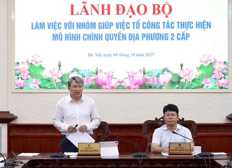 Báo cáo tại buổi làm việc, Vụ trưởng Vụ Tổ chức cán bộ Phan Thị Hồng Hà cho biết, Bộ Tư pháp đã thành lập Tổ công tác và Nhóm giúp việc triển khai chủ trương tổ chức chính quyền địa phương hai cấp theo Quyết định số 2954 và 2987/QĐ-BTP. Vụ Tổ chức cán bộ được giao làm đầu mối, rà soát 8 kết luận của Bộ Chính trị, Ban Bí thư và xây dựng kế hoạch 15 nhiệm vụ cụ thể; phân công các đơn vị chức năng như Vụ Pháp luật hình sự - hành chính, Cục Bổ trợ tư pháp, Cục Hành chính tư pháp, Văn phòng Bộ… thực hiện theo chức năng.