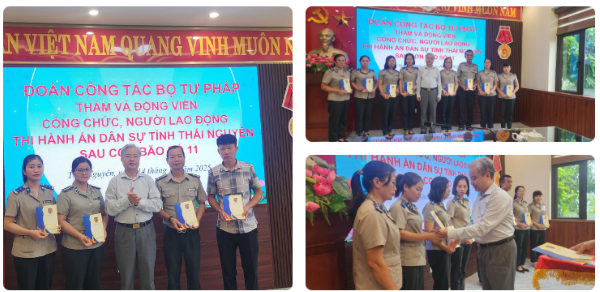 Ngày 14/10, Đoàn công tác Bộ Tư pháp do ông Nguyễn Quang Thái, Phó Bí thư chuyên trách Đảng ủy Bộ Tư pháp làm Trưởng đoàn, đã đến thăm hỏi, động viên và trao quà hỗ trợ cán bộ, công chức, người lao động của Cục Thi hành án dân sự (THADS) tỉnh Thái Nguyên, Sở Tư pháp tỉnh Thái Nguyên và Trường Cao đẳng Luật miền Bắc bị thiệt hại nặng nề do hoàn lưu bão số 11.