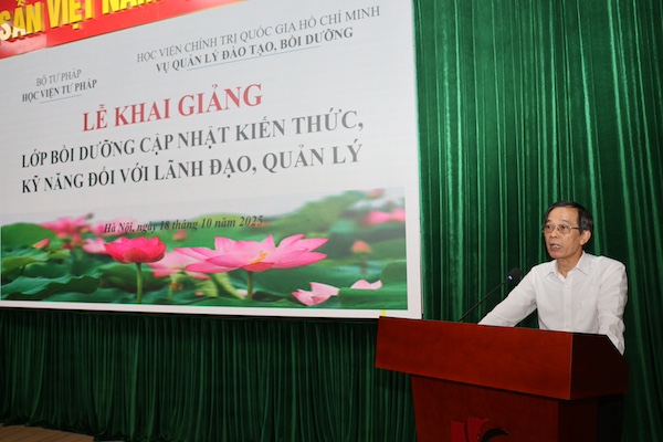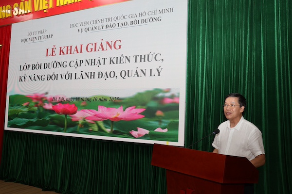 Triển khai Kế hoạch đào tạo, bồi dưỡng trong nước cho công chức, viên chức Bộ Tư pháp năm 2025, ngày 18/10/2025, Học viện Tư pháp phối hợp với Học viện Chính trị Quốc gia Hồ Chí Minh khai giảng Lớp bồi dưỡng cập nhật kiến thức, kỹ năng đối với cán bộ lãnh đạo, quản lý theo Quy định số 145-QĐ/TW ngày 10/5/2024 của Bộ Chính trị về chế độ bồi dưỡng, cập nhật kiến thức, kỹ năng đối với cán bộ lãnh đạo, quản lý các cấp.