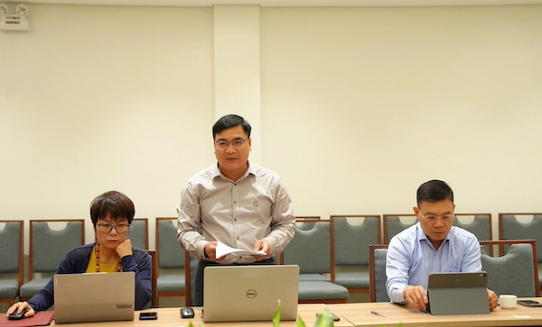 Phó Vụ trưởng Vụ CTXDVBQPPL Lê Tuấn Phong báo cáo tại buổi làm việc.