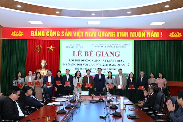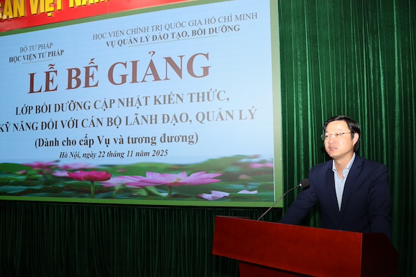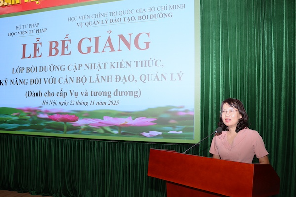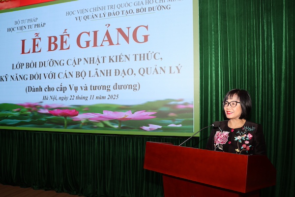 Ngày 22/11/2025, Học viện Tư pháp phối hợp với Học viện Chính trị Quốc gia Hồ Chí Minh tổ chức bế giảng Lớp bồi dưỡng cập nhật kiến thức, kỹ năng đối với cán bộ lãnh đạo, quản lý theo Quy định 145 (dành cho cấp Vụ và tương đương).