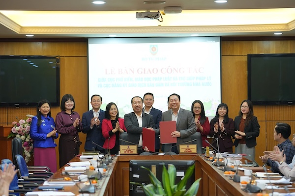 Trước sự chứng kiến của các Thứ trưởng và đại diện lãnh đạo một số đơn vị thuộc Bộ, ông Lê Vệ Quốc và ông Cù Thu Anh đã ký Biên bản bàn giao công tác giữa Cục PBGDPL&TGPL và Cục Đăng ký giao dịch bảo đảm và Bồi thường nhà nước.